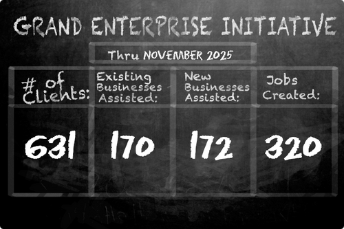 - Existing businesses assisted: the number of existing businesses working with the Grand Enterprise Initiative. These businesses may want to expand, change their model or otherwise modify their business workings.